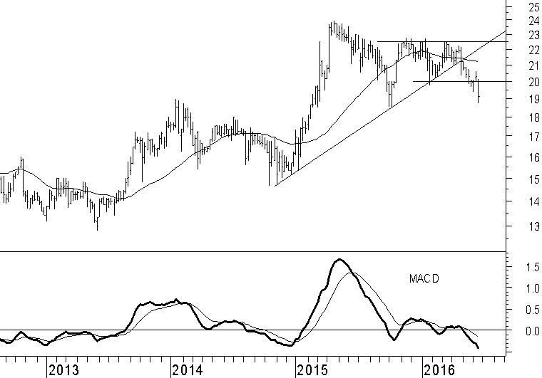 Beter Bed kon lange tijd geen richting kiezen. Van eind 2015 tot recent was er sprake van een status-quo tussen vraag en aanbod. Aan de onderkant kwam vraag naar het aandeel los rond €20. Aan de bovenkant zorgde het €22-niveau meerdere keren voor overtollig aanbod in het aandeel. Binnen deze bandbreedte heerste evenwicht. Afgelopen week is dat evenwicht verstoord, na de val onder het steunniveau rond €20. In de weekgrafiek is nu een duidelijke dalende trend te zien, die wordt bevestigd door de onderliggende MACD-indicator. Op basis van de hoogte van de zojuist verlaten bandbreedte verwachten wij een daling naar €17,50. Dat is tevens het eerste koersdoel. Eventuele herstelbewegingen zullen nu weerstand ondervinden rond het voormalige steunniveau, dat nu dienstdoet als weerstand rond €20.
