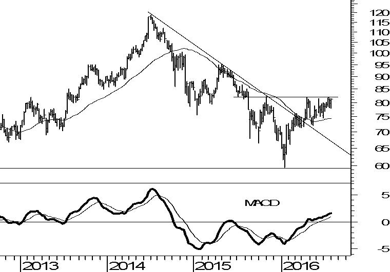 Schlumberger (SLB) heeft een neutraal koersbeeld. Vanaf de top in 2014 tot begin dit jaar werden almaar lagere toppen en bodems gevormd in de weekgrafiek. In april werd de dalende weerstandslijn die de toppen met elkaar verbindt echter opwaarts doorbroken, net als het toen nog dalende 40-weeks voortschrijdend gemiddelde. Er was daardoor geen sprake meer van een dalende trend.