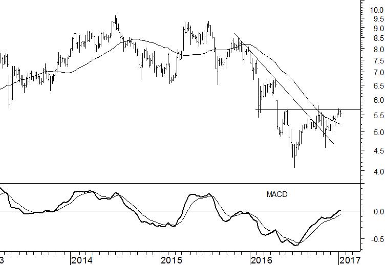 In de weekgrafiek is te zien dat eerdere herstelbewegingen diverse keren rond €5,65 zijn stukgelopen. Hierdoor ontstaat een flinke weerstand in het collectief geheugen van beleggers. Boven het €5,65-niveau gaat een nieuwe stijgende trend van start, maar voorlopig hanteren wij een houdadvies.