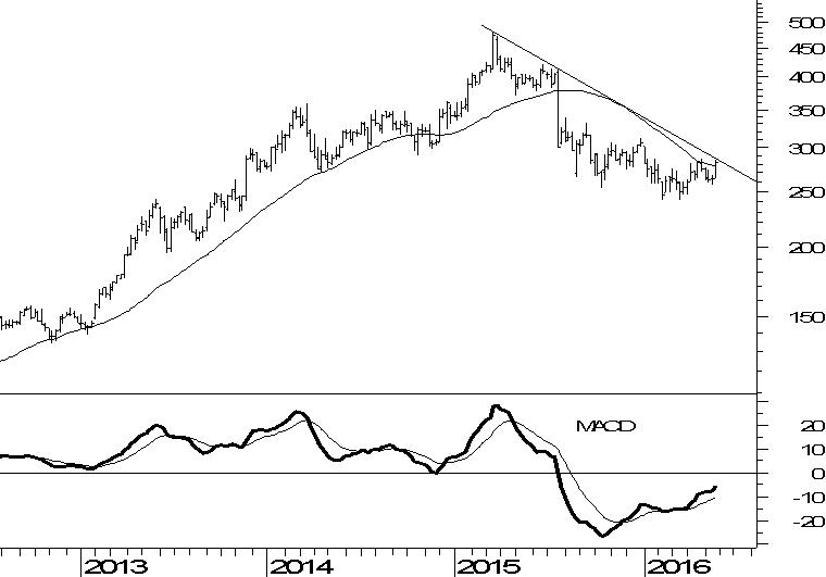 Biogen (BIIB) kent een negatief technisch beeld. De bewijsmiddelen daarvoor zijn duidelijk aanwezig in de vorm van de dalende weerstandslijn en het naar beneden wijzende verloop van het 40-weeks gemiddelde. Aan de andere kant is de dalende trend wel degelijk gestagneerd in de laatste maanden. Een positieve en oplopende MACD-indicator en licht hogere koersbodems wijzen daarop. Op dit moment is de koers in gevecht met een belangrijke weerstand rond $280. Daar komen de eerder genoemde gemiddeldelijn en de dalende weerstandslijn samen om te zorgen voor een sterke hindernis. De grootste kans dichten wij dan ook toe aan een nieuwe dalende impulsbeweging. Uiteindelijk moet dit leiden tot een nieuw dieptepunt binnen de dalende trend en een evenaring van het koersdoel op $200.
