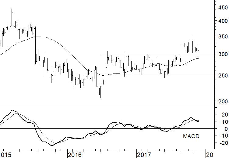 Biogen (BIIB) doorbrak in september de psychologische en grafiektechnische grens op $300. De weekgrafiek laat het belang van deze barrière zien. Na een initiële voortzetting van de nieuw gevormde stijgende trend is het aandeel teruggevallen. Niet toevallig heeft daarbij het $300-niveau als steun gefungeerd. Het aandeel lijkt nu op te veren vanaf dit steunniveau en luidt daarmee een nieuwe fase in op weg naar het koersdoel op $350. Dit koersdoel kan binnen enkele weken worden bereikt.