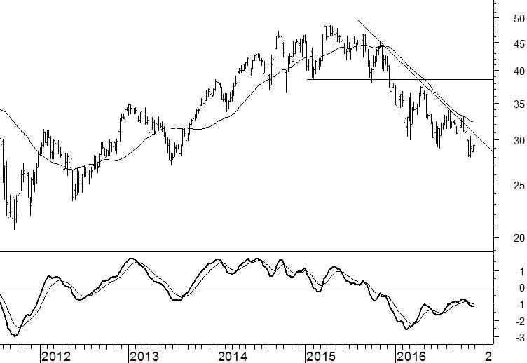 Om te ontsnappen aan deze trend is het nodig dat de dalende weerstandslijn en het 40-weeks gemiddelde naar boven worden gekruist. Dat zal pas het geval zijn boven €32. Ook de onderliggende MACD-indicator wijst – vanwege een negatieve kruising – nog niet op een stabiliserend of hoger koersverloop. Mocht Boskalis Westminster doorschieten tot onder het dieptepunt van 2013, dan ontstaat een verder neerwaarts potentieel naar €23.