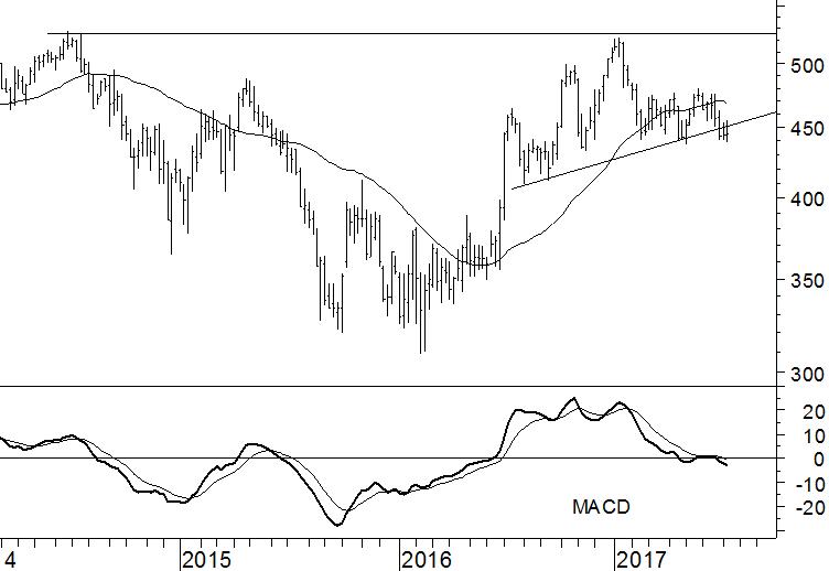 BP piekte in de eerste week van 2017 op 520p. Dat was een evenaring van het hoogtepunt van 2014, wat aangeeft dat beleggers een goed geheugen hebben om rond oude koerstoppen opnieuw te verkopen. Echter, het afketsen van een oude koerstop hoeft niet het einde van de stijgende trend te betekenen. Het einde werd wél ingeluid door de recente verzwakking in het trendbeeld als gevolg van de val onder het 40-weeks gemiddelde en onder de oplopende steunlijn.