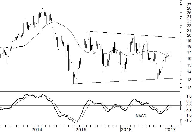 Deze verwachting komt voort uit de terugkeer van Brunel boven het 40-weeks gemiddelde. Ook de onderliggende MACD-indicator laat een verbetering zien met een doorbraak boven de nullijn. De komende weken verwachten wij dan ook zijwaartse tot hogere koersen. Aan de bovenkant is er de nodige weerstand rond €19 en vooral rond het hoogtepunt van 2015 op €20,80. Nu het onmiddellijke koersrisico is geweken, is er ruimte voor een adviesverhoging naar ‘houden’.