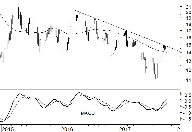Toch lijkt de koersvorming van de afgelopen weken wat anders te suggereren. Nu het aandeel boven het 40-weeks gemiddelde en de dalende weerstandslijn is uitgebroken, komt ook een einde aan de dalende trend. Bemoedigend is dat de MACD-indicator voor het eerst in lange tijd weer is teruggekeerd boven de nullijn. Dat geeft aan dat het momentum zich weer omhoog beweegt. Nu het neerwaartse risico is afgenomen, verhogen wij het advies voor Brunel naar ‘houden’.