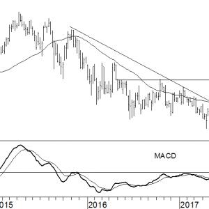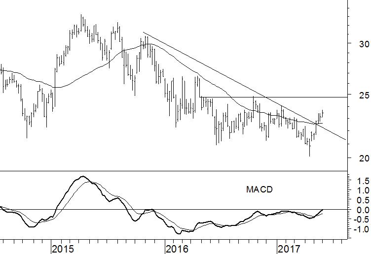 Aan deze dalende trend is nu een eind gekomen. Een teken van kracht is dat beleggers het aandeel Carrefour boven €22,50 hebben getild. Daar lag een flinke weerstand in de vorm van zowel de dalende weerstandslijn als het 40-weeks gemiddelde.