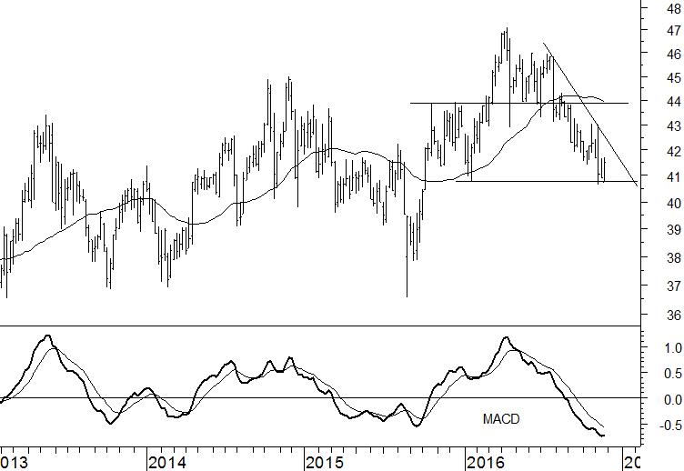 Wel speelt het aandeel op dit moment met het steunniveau rond $41. Dit zorgt wellicht voor een tijdelijke opleving, maar op de langere termijn verwachten wij een aanhoudende koersdruk. Een uiteindelijke daling naar het dieptepunt van 2015 rond $37 is zeker mogelijk.