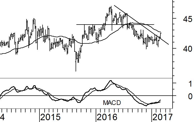 Deze ontwikkeling is zonder meer positief. Maar tegelijkertijd ook nog pril en we verzamelen graag nog wat extra bewijsmateriaal. Dat kan zijn in de vorm van een doorbraak van het voortschrijdend gemiddelde (de koers staat er nog onder), of een doorbraak van de MACD-indicator boven de nullijn (hoewel dit nog wel even kan duren). Een andere mogelijkheid is de vorming van een wederom iets hogere koersbodem.
