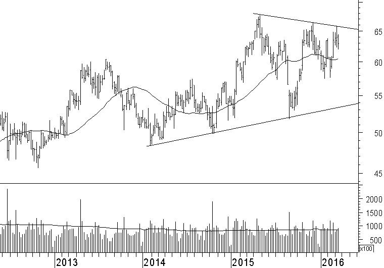 DANONE (BN) komt net als veel andere Europese aandelen niet verder dan een neutraal technisch beeld. In het geval van Danone worden de koerstoppen in de laatste maanden telkens op een lager niveau geplaatst. De meest recente koersbodem is juist weer hoger geplaatst en dat geeft koopinteresse aan. Voorlopig verwachten wij dat Danone binnen de kaders van het neutrale technische beeld zal blijven. Dit kader eindigt wanneer beleggers Danone boven €65 tillen. In dat geval breekt Danone duidelijk uit. Een negatief scenario omvat een terugval naar de koersbodem van dit jaar op €58. Zelfs een val onder dit koersniveau is niet uitgesloten. Zowel het positieve scenario van een doorbraak boven €65 als het negatieve scenario met een val onder €58 houden wij open. In de komende weken verwachten wij niet snel een einde aan het huidige evenwicht tussen vraag en aanbod. Het houdadvies blijft dan ook van kracht totdat een van deze grenzen wordt doorbroken.