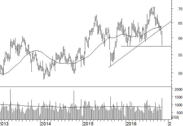 Normaal gesproken levert dat een sterk vangnet op onder de actuele beurskoers. Maar met de val onder het €63-niveau is alle kans op een stijgend koersverloop verkeken. Vooral de bovengemiddelde omzet waarmee het steunniveau is gebroken maakt indruk. Wij zijn meer dan tevreden wanneer zich de komende maanden een zijwaarts koersverloop aftekent met €57,50 als nieuw steunniveau. Dat is het hoofdscenario.