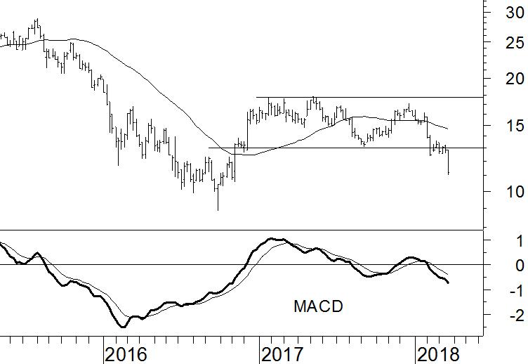 Net als bij veel andere Europese bankaandelen is de trend voor Deutsche Bank neerwaarts gedraaid. De koers heeft nog een tijdlang in een zijwaartse beweging gezeten met steun op €13 en weerstand op €18. Nu het aandeel door de onderkant van de zijwaartse range is gezakt, is ook een koersdoel te bepalen. Dat doen we door het zijwaartse patroon om te klappen (pendulum-swingmethode). Aangezien de hoogte van de zijwaartse beweging €5 (€18-€13) bedroeg, kan het koersdoel worden bepaald op €8 (€13-€5). Dat is iets onder het laagste niveau van 2016. Mogelijk vindt het aandeel hier ook steun.