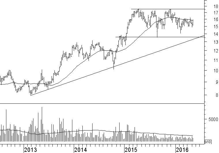 Deutsche Telekom is een saaie belegging. Al meer dan een jaar beweegt de koers hoofdzakelijk zijwaarts. Als gevolg daarvan heeft ook het 40-weeks gemiddelde een horizontaal verloop gekregen. Met de huidige positie van het aandeel in het midden van de bandbreedte hebben wij geen duidelijke verwachting voor de koersrichting in de komende weken. Wel weten we dat een eventuele correctie terug naar €13,50 op de nodige koopinteresse zal kunnen rekenen. Rond dat niveau komt namelijk de oplopende steunlijn samen met het horizontale steunniveau. Beleggers die graag op zwakte kopen, kunnen rond €13,50 hun slag slaan. Aan de bovenkant wordt de koersvorming beperkt door de weerstand rond €17,50. Al meer dan een jaar is de bandbreedte tussen €13,50 en €17,50 het speelveld voor Deutsche Telekom en wij handhaven het houdadvies.