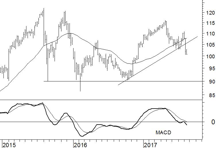 Disney (DIS) maakt de hoge verwachtingen niet waar. Enkele weken geleden schreven wij nog dat de stijgende trend ternauwernood werd gered door een verse opleving. Tot een door ons verwachte evenaring van het hoogtepunt van 2017 op $116 is het niet gekomen. Inmiddels is het technische beeld zwaar beschadigd geraakt. Niet alleen het 40-weeks gemiddelde is in neerwaartse richting gebroken, ook de oplopende steunlijn heeft de verkoopdruk niet weten op te vangen.