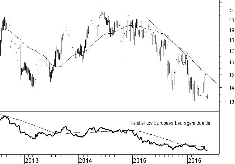 Engie behoort al sinds begin 2015 tot de zwakke broeders binnen het Europese aandelenlandschap. Het was mei 2015 toen het aandeel een begin maakte met de dalende trend. Sindsdien is daaraan niets veranderd. De weekgrafiek laat zien dat het grotere patroon van toppen en bodems nog steeds neerwaarts is gericht, net als het 40-weeks gemiddelde. Een vers dieptepunt binnen de dalende trend is nog niet gevestigd, maar wij verwachten dat dit de komende maanden wel zal gebeuren. Dat betekent een koersval tot onder €13, waarbij het koersdoel op €12 binnen handbereik komt.