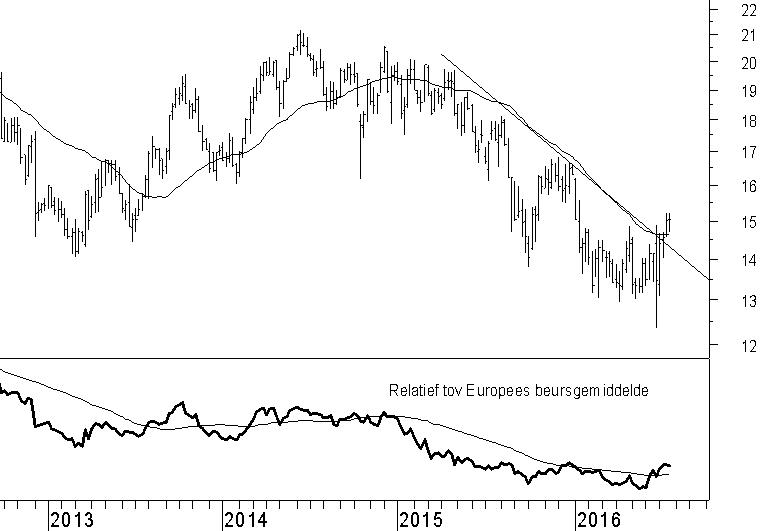 Engie ging lange tijd gebukt onder een dalende trend. In de weekgrafiek is goed te zien dat de belangrijkste toppen en bodems vanaf begin 2015 neerwaarts gericht zijn geweest. Al die tijd is de beurskoers van Engie onder het 40-weeks gemiddelde gebleven, dat zelf ook een neerwaarts verloop kende. Daarom is het goed om te zien dat deze negatieve kenmerken van het technische beeld nu zijn gedraaid. De gemiddeldelijn loopt weer vlak met Engie aan de bovenkant. Tevens is de dalende weerstandslijn rond €14,50 doorbroken. De koersdruk is dan ook duidelijk afgenomen. Het meest waarschijnlijk is een meer zijwaarts tot licht hoger koersverloop in de komende weken. Voor een nieuwe stijgende trend is het nog te vroeg. Daarvoor is een patroon van hogere toppen en bodems nodig. Wel is de verbetering van het technische beeld belangrijk genoeg om het advies te verhogen naar ‘houden’.
