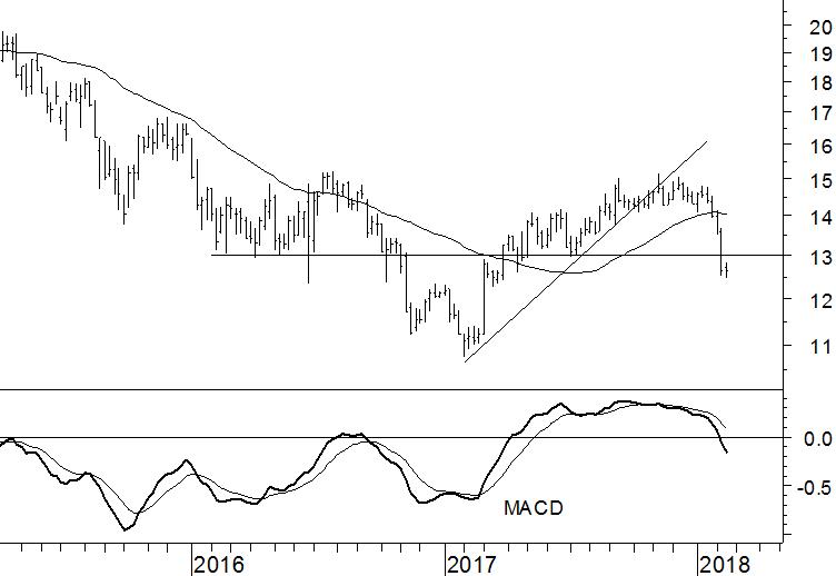 In dat proces sneuvelde als eerste de stijgende trendlijn, die was getrokken onder de bodems in 2017. Van recente datum is de val onder het 40-weeks gemiddelde en zelfs onder het steunniveau rond €13.