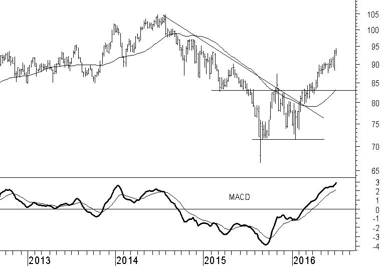 Exxon Mobil (XOM) is een goed voorbeeld van het positieve technische beeld van veel Amerikaanse aandelen. Na het omkeerpatroon in de weekgrafiek dat in april werd afgerond heeft de stijgende trend zich gestaag uitgebouwd. Het destijds geformuleerde koersdoel op $97,50 komt met rasse schreden dichterbij. Wellicht dat het bereiken van dit niveau de aanleiding is voor een correctie. Elke correctie in de weekgrafiek van Exxon Mobil zien wij echter als een goedkoop instapmoment binnen de stijgende trend. In een uiterste geval zal zelfs een correctie terug naar $85 geen einde maken aan de stijgende trend en na een opleving juist zorgen voor een hogere koersbodem in de weekgrafiek.