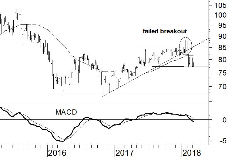 Novartis heeft een zogeheten ‘failed breakout’ laten zien. De koers wist weliswaar de weerstand rond de CHF85 te doorbreken, maar zakte daarna sterk terug. Het was opvallend dat de uitbraak amper twee weken duurde. De bar van de tweede week was ongeveer even lang als die van de vorige week, maar kende een tegengestelde richting. Het weekslot lag lager dan de weekopening, terwijl bij de eerste uitbraakbar het slot hoger lag dan de opening.