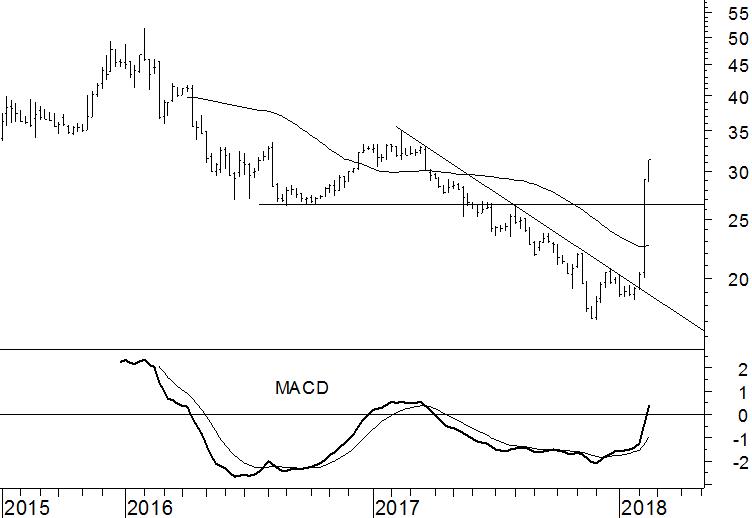 Eerst de dalende weerstandslijn, daarna de weerstanden van het 40-weeks gemiddelde en de horizontale trendlijn op €26,50. De daling die aan de uitbraak voorafging werd vergezeld van een gelijkblijvende MACD-lijn, ofwel een positieve divergentie van de tweede orde. Dat is opvallend.