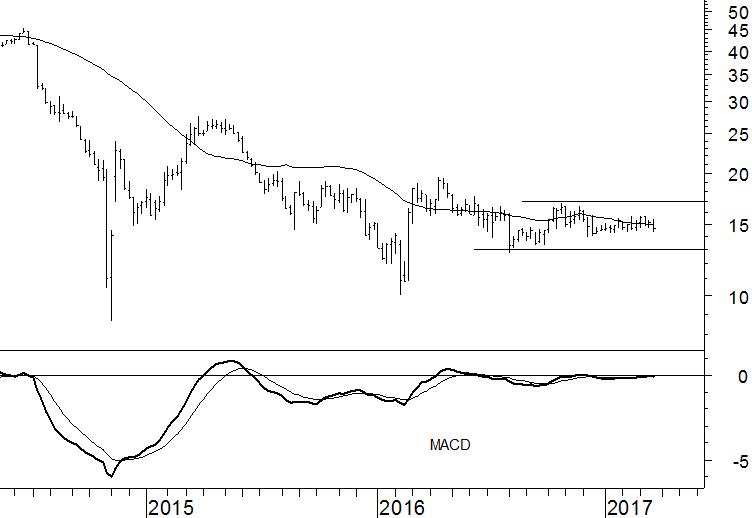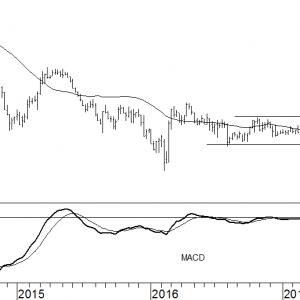Anders gezegd, vraag en aanbod in aandelen Fugro zijn goed met elkaar in evenwicht. Dat blijkt uit het vlakke verloop van het 40-weeks gemiddelde en een MACD-indicator die horizontaal langs de nullijn beweegt.