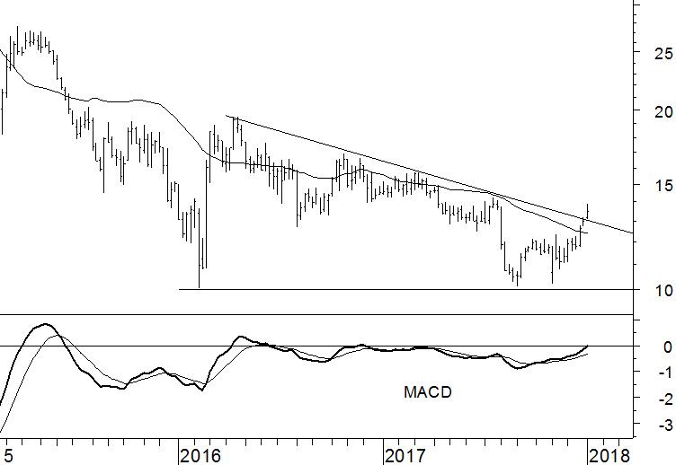 Fugro heeft in 2017 niet kunnen profiteren van het positieve beursklimaat en sloot het jaar af met een negatief rendement van ruim 10%. 2018 kan een stuk beter uitpakken voor Fugro. Het technische beeld is verbeterd. Niet alleen is de koers voor het eerst in lange tijd boven het 40-weeks gemiddelde uitgebroken, ook de dalende weerstandslijn is opwaarts gepasseerd. Van een dalende trend is geen sprake meer. Dat het technische beeld in positieve zin is gedraaid, blijkt ook uit de onderliggende MACD-indicator. Die noteert voor het eerst in negen maanden weer boven de nullijn.
