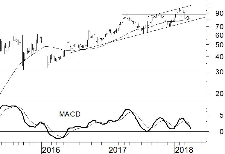 Een trendomkeer vindt pas plaats als daarvoor meerdere technische signalen worden afgegeven. Bijvoorbeeld een ander patroon van toppen en bodems en doorbraken door belangrijke trendlijnen. Zo’n uitbraak moet dan het liefst plaatsvinden bij een hoog beursvolume. Van dergelijke omkeersignalen is bij Galapagos geen sprake. Wel was er begin januari een belangrijk positief wapenfeit: de doorbraak door de horizontale weerstand net onder de €90.
