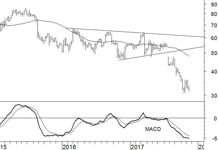 Gemalto toont in de weekgrafiek een patroon dat niets aan duidelijkheid te wensen overlaat. Eind juli zakte het aandeel door de ondergrens van het symmetrische driehoekspatroon. De dalende trend die hierdoor werd opgestart, doet precies wat wij hadden verwacht. Inmiddels is het aandeel bijna afgedaald tot het koersdoel op €30. Het is slechts een kwestie van tijd voordat Gemalto dit laagste koersniveau sinds 2011 zal evenaren.