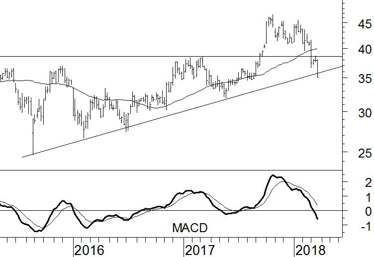 General Motors is een van de Amerikaanse aandelen die een trendbreuk laten zien. De koers is in korte tijd met ruim $10 gezakt. Het aandeel is terechtgekomen onder de stijgende steunlijn die is getrokken onder de bodems vanaf 2015. De doorbraak was kortstondig, en het is nog afwachten of hij doorzet. In de technische analyse heeft een doorbraak pas betekenis als hij meerdere dagen duurt of met minimaal 2 tot 3% plaatsvindt.