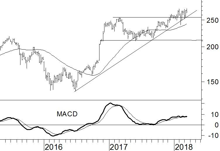 Daarna wist het aandeel op te klimmen en de aanval te openen op de weerstand van de vorige top op $255. Met succes, want inmiddels is ook een nieuwe stijgende steunlijn zichtbaar. Tevens is het 40-weeks gemiddelde weer opwaarts gekruld, hetgeen een bevestiging is dat de opwaartse trend inderdaad nog steeds intact is. Het gaat allemaal nog niet van harte, maar zolang de koers boven de horizontale trendlijn op $255 blijft, houden we het aandeel op de kooplijst. Het koersdoel ligt nu op $310.