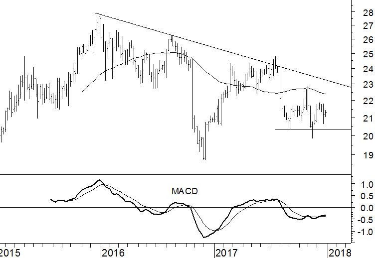 Een indicatie aan welke kant het aandeel uiteindelijk zal uitbreken is moeilijk te geven. Op dit moment hebben wij een lichte voorkeur voor een uiteindelijke neerwaartse doorbraak onder €20,50. Dit vanwege de grotere dalende weerstandslijn en de negatieve positie van de MACD-indicator. Een duidelijke aanwijzing is dit niet en daarom handhaven wij het actuele houdadvies.