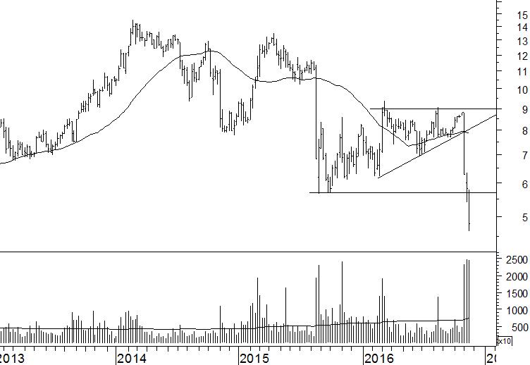 Begin november brak de stijgende trend en was het steunniveau rond €5,70 de laatste mogelijkheid om een verdere verslechtering van het trendbeeld te voorkomen. Nu ook dit steunniveau is gesneuveld, staat niets een dalende trend in de weg.