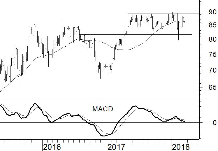Het wil het laatste jaar niet vlotten met Heineken. Begin februari kwam de koers in een snelle, kortstondige daling terecht. Daarbij werd de steun van de vorige bodem op €82 intraweek doorbroken. Hoewel de koers daarna herstelde is het technische beeld toch gewijzigd.