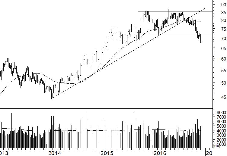 Daarmee gaat een nieuwe dalende trend van start. In de weekgrafiek is de metamorfose van een stijgende naar een dalende trend nu voltooid. De volumegegevens op de beurs bevestigen deze gedaantewisseling. De dalingen blijken plaats te vinden op hogere volumes, net als de meest recente koersval onder het steunniveau rond €71.