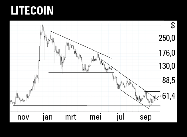 Na lange tijd in een dalende trend te hebben gezeten, is de litecoin opgeveerd van de belangrijke horizontale steun op $48,50. Het koersherstel reikt nu zo ver dat het dalende trendkanaal opwaarts is uitgenomen. Positieve tekenen, maar het is nog te vroeg om te kopen. Pas bij een doorbraak door de horizontale weerstand op $68,50 ben ik overtuigd.
