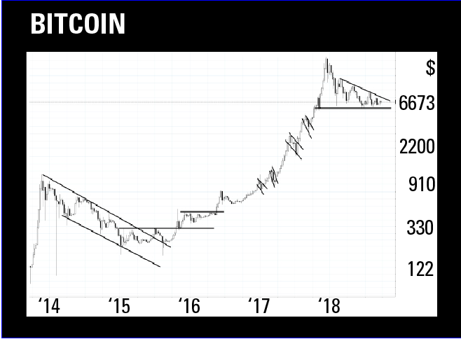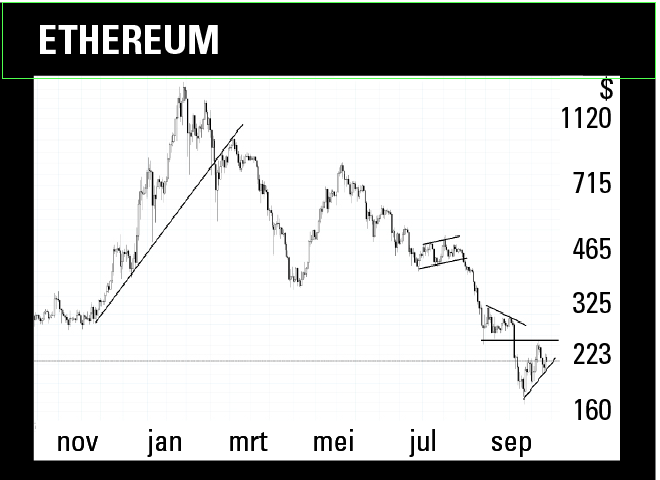 Bitcoin verliet halverwege 2015 een dalend trendkanaal, om daarna aan een stevige opwaartse trend te beginnen. Aanvankelijk zakte de koers nog terug naar het oude dalende trendkanaal, maar daarna ging het snel omhoog. We zien diverse vlagpatronen tijdens de stijging: pauzepatroontjes tegen de trend in, waarbij speculanten even op adem willen komen. De all time high werd eind 2017 rond de $20.000 bereikt. Daarna kwam de klad erin. We zien nu een grote dalende driehoeksformatie. De toppen liggen lager, maar de bodems liggen grosso modo op gelijke hoogte, rond de $5700 en $6000.