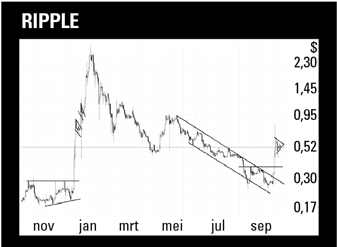 In de daggrafiek van ripple zien we een interessant patroon. De koers is uit een dalend trendkanaal gebroken en heeft in sneltreinvaart ook de weerstand van een belangrijke vorige top op $0,37 overwonnen. Dit is een koopsignaal voor de middellange termijn. We zien wel een pauzepatroon in de vorm van een wimpel, die erop duidt dat beleggers op adem willen komen na de forse stijging van de laatste weken. De kans op een opwaartse uitbraak uit de wimpel is het grootst. Mocht de koers echter toch door de onderkant van de wimpel zakken, dan is het advies om af te wachten waar de nieuwe bodem wordt gevormd.