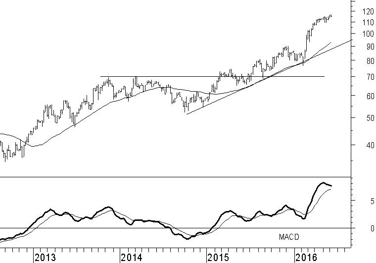 Hochtief behoort met zekerheid tot de sterkste aandelen in Europa. De weekgrafiek is een goed voorbeeld van een stabiel patroon van hogere toppen en bodems. Dit patroon werd samen met het huidige koopadvies in februari 2015 ingezet en is tot op de dag van vandaag actueel. Beleggers met Hochtief in portefeuille heeft dit geen windeieren gelegd. Tot op de dag van vandaag is er sprake van een kreukloos technische beeld. Het 40-weeks gemiddelde wijst omhoog met het aandeel ruim daarboven. Zelfs de onderliggende MACD-indicator geeft nog niet aan dat het opwaartse momentum aan kracht verliest. Onze ogen blijven dan ook gericht op het bovenliggende koersdoel op €120. Tussentijdse correcties bieden een goedkoper instappunt voor twijfelende beleggers.