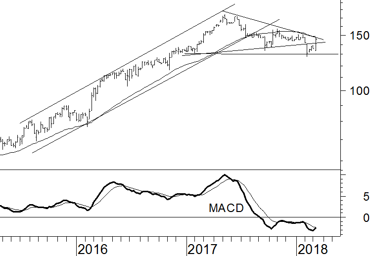 Hochtief staat al sinds afgelopen herfst op de verkooplijst. Toen zakte het aandeel door de onderkant van het stijgend trendkanaal. Daarnaast veranderde het 40-weeks voortschrijdend gemiddelde van richting: van stijgend naar dalend. Wat volgde was een driehoeksformatie. Daaruit zakte de koers weg, keurig conform verwachting, om zo het eerder afgegeven verkoopsignaal te bevestigen. Het aandeel wist echter steun te vinden op €130, om vervolgens krachtig op te veren. Door dit herstel staat het verkoopadvies nu op een verlies van zo’n 10%.