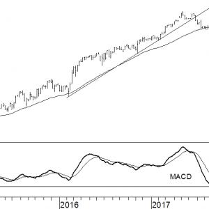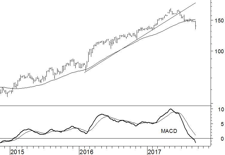 Hochtief heeft jarenlang een positief technisch beeld gekend. Van januari 2015 tot september 2017 is de weekslotkoers van het aandeel onafgebroken boven het 40-weeks gemiddelde gebleven. Dat is een bewijs dat trends vaak langer aanhouden dan gedacht. Maar aan alles komt een eind, ook aan een stijgende trend. De recente koersval onder het 40-weeks gemiddelde rond €150 is het teken dat de koopinteresse in aandelen Hochtief is weggevallen. Ook de onderliggende MACD-indicator is voor het eerst in meer dan twee jaar onder de nullijn gedoken. Allemaal aanwijzingen dat de stijgende trend is gesneuveld.