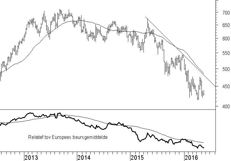 HSBC heeft niet geprofiteerd van de opleving in het algemene beursklimaat sinds half februari. Op zich niet verwonderlijk omdat het aandeel al in de zomer van 2015 in een dalende trend terechtkwam. Sindsdien is het patroon van lagere toppen en lagere bodems een schoolvoorbeeld daarvan. Vanzelfsprekend kennen ook het 40-weeks gemiddelde en de bovenliggende weerstandslijn een dalend verloop. In de komende weken verwachten wij aanhoudende koersdruk, waarbij HSBC op weg kan gaan naar het neerwaartse koersdoel op 350 pence. Niet alleen wij, maar ook andere beleggers laten HSBC links liggen. Dat blijkt wel uit het dalende verloop van de relatievesterktelijn.