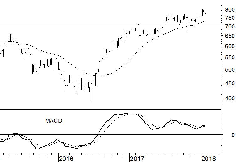 HSBC kent een uiterst gezonde stijgende trend. Dat is al het geval sinds augustus 2016. Na de afrekening met de weerstand op 710p waren er geen belemmeringen meer voor een langdurige stijging. Positieve elementen die het technische beeld ondersteunen zijn het opwaartse verloop van het 40-weeks gemiddelde en de positief gekruiste MACD-indicator. Het aandeel is goed op weg naar het koersdoel op 800p.