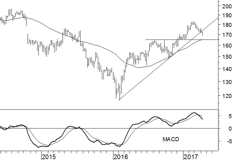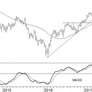 Op dit moment maakt IBM opnieuw een correctie door. Dat blijkt wel uit de val onder de steunlijn en de negatieve kruising van de MACD-indicator. Maar dit hoeft niet het einde te zijn van de stijgende trend. Het steunniveau op €165 wordt daarbij cruciaal. Onze verwachting is dat nieuwe koopinteresse ontstaat in de nabijheid van dit koersniveau. De oude top van 2016 en de genoemde gemiddeldelijn komen hier samen als vangnet onder de koers.