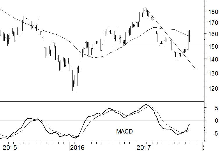 De dualiteit wordt goed weergegeven door de MACD-indicator. Deze bevindt zich duidelijk onder de nullijn (=negatief) maar vertoont wel een opwaarts verloop (=positief). Uitkomst biedt in een dergelijk geval de maandgrafiek. Hieruit blijkt dat er in de laatste jaren redelijk overtuigend sprake is van een neerwaartse trend. Dit maakt het aannemelijk dat de recente opleving plaatsvindt binnen een dalende trend. ‘Verkopen’ blijft daarom het devies.