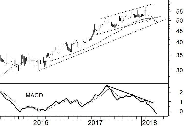 Negatieve divergenties zijn op zichzelf nooit verkoopsignalen, maar in combinatie met andere koerspatronen zijn het wel belangrijke waarschuwingen. Een eerste waarschuwing is de neerwaartse doorbraak van het stijgend trendkanaal. Dit is nog te mager voor een verkoopadvies. Daarvoor zou er ook een doorbraak moeten zijn van de stijgende steunlijn, die is gevormd vanaf de bodems van begin 2016.