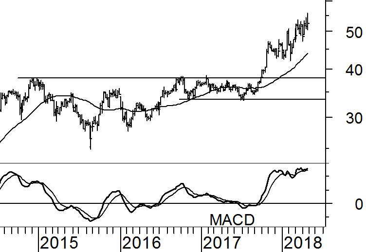 Intel geniet sinds oktober vorig jaar een koopadvies en daar brengen we voorlopig geen verandering in. Aanleiding voor de adviesverhoging destijds was de doorbraak door de trading range waarin het aandeel zich in 2016 en 2017 ophield. Sindsdien ontwikkelt de koers van Intel zich volgens het boekje. Na de uitbraak was er even sprake van een consolidatie, maar vervolgens vormde zich een serie hogere toppen en bodems.