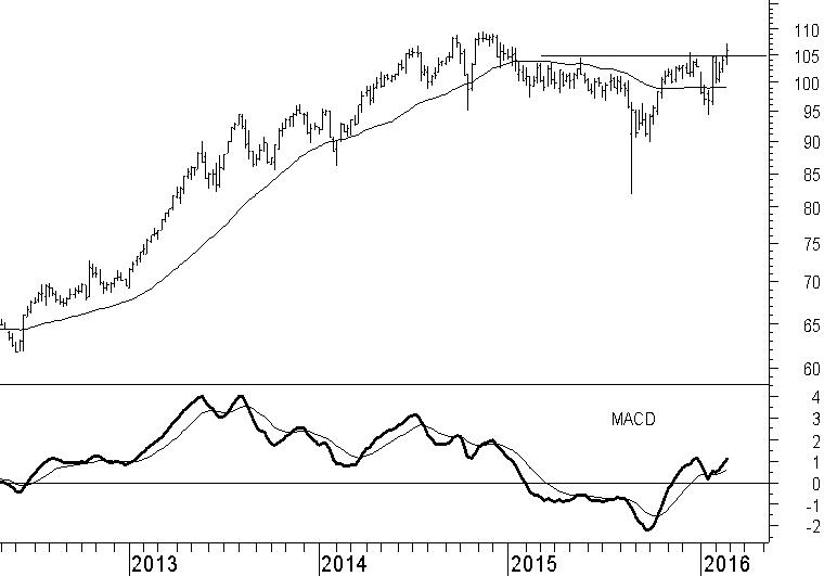 Johnson & Johnson kent geen spectaculair koersverloop. Toch is het technisch beeld langzaam maar zeker verbeterd in de laatste weken. De belangrijkste aanwijzing daarvoor is het vermogen van het aandeel om uit te stijgen boven de weerstand rond $105. Dat opent de weg naar hogere koersniveaus. Een eerste test van de nieuwe stijgende trend zal volgen wanneer het historische hoogtepunt van eind 2014 rond $110 wordt geëvenaard. Onze verwachting is dat dit hoogtepunt wordt overtroffen waarna het aandeel de weg omhoog kan vervolgen. Een eerste koersdoel ligt op $115. Het positieve technische beeld wordt ondersteund door de onderliggende MACD-indicator. Een tijdelijke terugval onder $105 zou ons niet direct zorgen baren; een val onder $100 wel. Dat is namelijk het niveau van het 40-weeks gemiddelde.