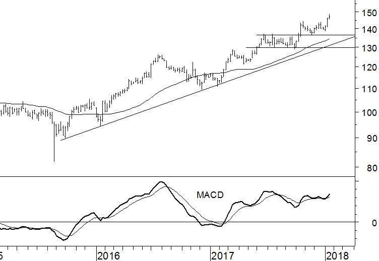 Alle signalen staan op groen voor een verdere koersstijging van het aandeel. In enkele weken kan het koersdoel op $160 al worden bereikt. Maar op de langere termijn liggen hogere niveaus in het verschiet. Tussentijdse correcties vinden steun rond $135, het niveau van het 40-weeks gemiddelde en een aantal toppen en bodems uit 2017. Waarschijnlijk zien we het $135-niveau niet meer terug. Vol overtuiging herhalen wij dan ook ons koopadvies.