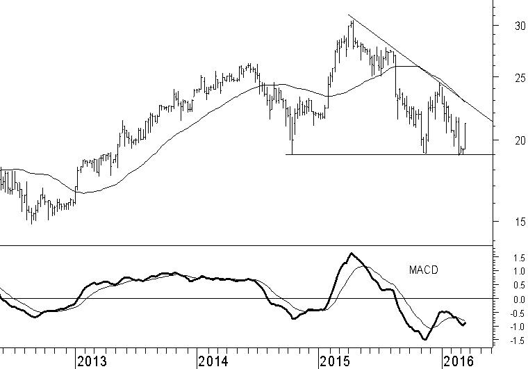 Kendrion veert goed op vanaf het onderliggende steunniveau rond €19. Eerlijk gezegd hadden wij verwacht dat het aandeel dit steunniveau in neerwaartse richting zou doorbreken, aangezien het grotere patroon van toppen en bodems neerwaarts was gericht – iets dat overigens nog steeds zo is. Ook het 40-weeks gemiddelde wijst nog in neerwaartse richting, en de koers van Kendrion bevindt zich daar al geruime tijd onder. Niets om enthousiast van te worden, al met al. Vandaar dat de opleving vanaf het €19-niveau ons heeft verrast. In de komende weken zal moeten blijken in hoeverre het herstel van blijvende aard is. Een echte verbetering van het technische beeld treedt pas op als de dalende weerstandslijn rond €22,50 wordt doorbroken. Deze wordt namelijk versterkt door de gemiddeldelijn, en voorziet in een logisch niveau in de weekgrafiek om nieuwe verkoopdruk te verwachten. Voorlopig handhaven wij dan ook het verkoopadvies.