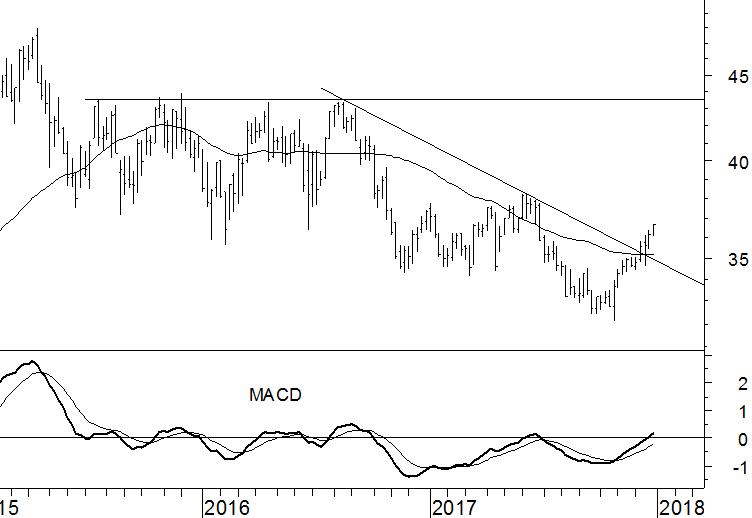 Klépierre heeft in korte tijd een positieve ommezwaai gemaakt in het technisch beeld. Begin december schreven wij nog dat het herstel in het aandeel op een flinke barrière stuitte rond €35. Tegen onze verwachting in blijkt de koopinteresse in het aandeel groot genoeg om deze barrière te slechten. Als gevolg daarvan is de beurskoers uitgestegen boven de combinatie van het 40-weeks gemiddelde en de dalende weerstandslijn. Beide komen samen rond de eerder genoemde €35.