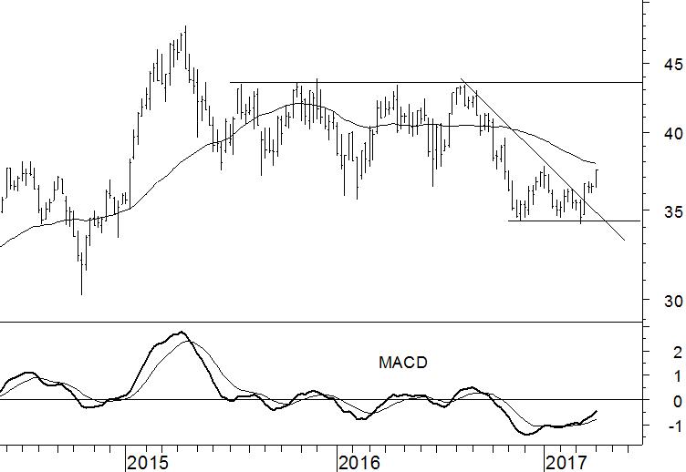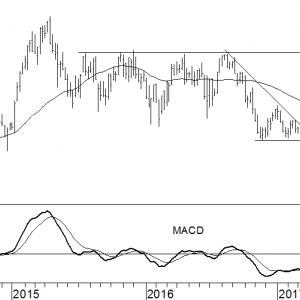 Klépierre heeft het lange tijd moeilijk gehad. In de weekgrafiek is duidelijk de dalende trend te zien die het aandeel maandenlang onder koersdruk heeft gehouden. Met de recente opleving komt aan deze periode een einde. Hoopgevende signalen zijn de doorbraak boven de weerstandslijn en een positieve kruising van de MACD-indicator.
